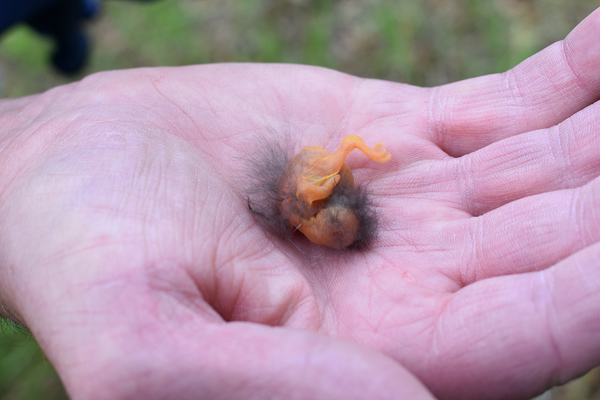 I was beyond ecstatic to have been able to see newly hatched bluebird young in one nest box. They were tiny and naked, save for some scrawny, fur-like feathers (a developmental state described as altricial, as defined in our previous blog post). When George made a quiet whistling sound, all of their beaks immediately snapped open, as if to receive food from their parent.